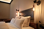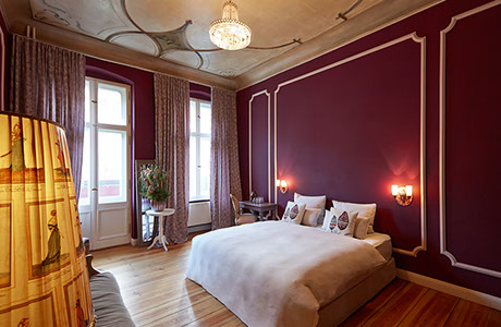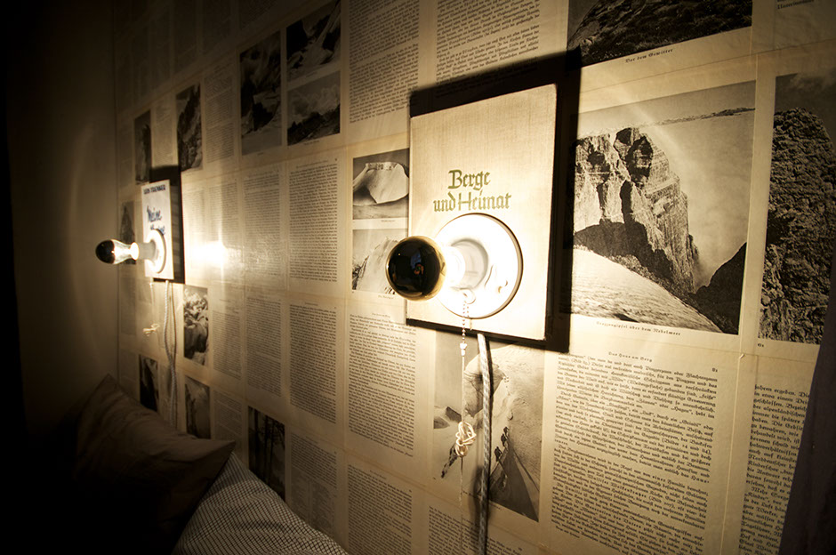 One small room with a double sized bed (140cm x 200cm), one larger room with two 160cm x 200cm beds and one lounge with sofa. Located on the first floor of a restored building with super high ceilings and large windows. The smaller room consists of a vintage wall rack and a niche is wallpapered with book pages of a famous German mountain climbers tales and adventures.