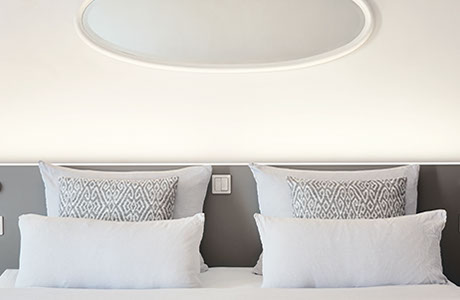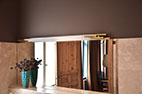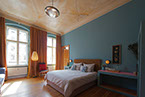 Geometric bronze coloured curtains add the perfect level of warmth back into the space. Lighting illuminates the ceiling revealing the details of the newly restored stucco in the room and bathroom.